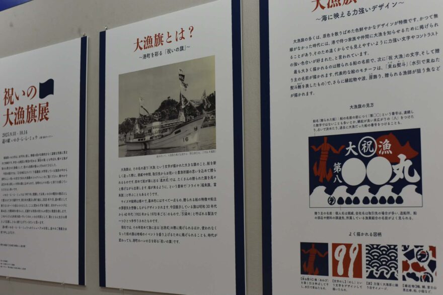 野村さんがまとめたパネルによれば、大漁旗とは、「大漁」という文字が描かれた大きな旗を差し、船を新しく造った際に、親戚や仲間、取引先からお祝いと豊漁祈願の思いを込めて贈られるものだといいます。サイズや絵柄はさまざまで、基本的にはすべて一点もので、贈られる船の特徴や船主の雰囲気を想像しながらデザインされています。