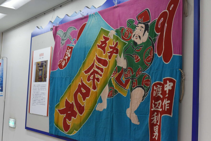 展示では、大漁旗のデザインを紹介する「大漁旗の見方」やその年の漁獲量を誇った船に贈られる旗「優勝旗」、大量を祝い、船主から船乗りたちに贈られる着物「万祝」が解説と共に紹介されました。