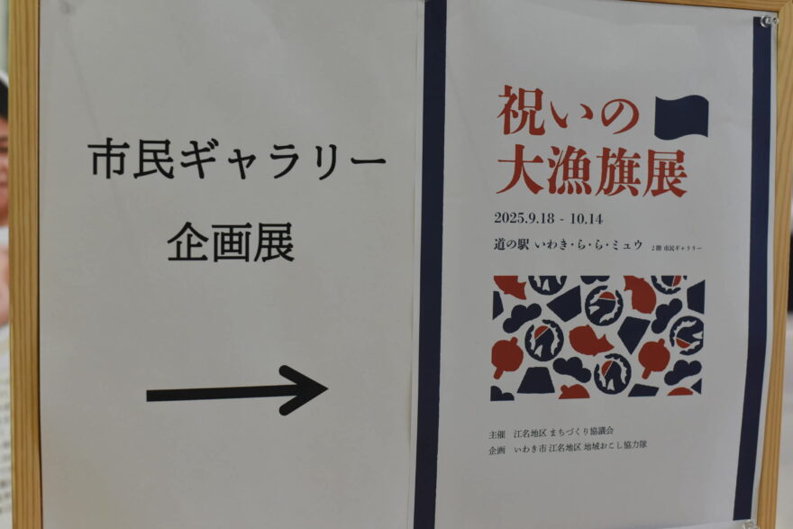 先日、いわき市小名浜にある道の駅「いわき・ら・ら・ミュウ」で、「祝いの大漁旗展」が開催されました。いわき・ら・ら・ミュウの2階にある展示スペース「市民ギャラリー」で開催され、道の駅に立ち寄った方が足を止め、展示を眺める様子が見られました。
