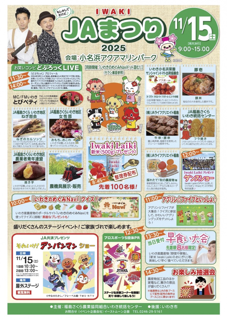 小名浜アクアマリンパークにて「IWAKI JAまつり2025」が開催されます。ネギやトマトなどいわきで収穫された農産物が並ぶ、年に1度の大型アグリイベント! 先着100名様につやつや輝くIwakiLaikiの新米をプレゼントいたします。ほかにも、IwakiLaikiの米粉を使用した餡たっぷりの「フラ焼き」や麓山高原豚・福島牛を使ったジューシーな焼串、秘伝のだれを使用した豚丼も味わえ、恵みの秋・食欲の秋を満喫できます。ステージでは、大人気お笑いコンビ「どぶろっく」のお笑いLIVEや、子どもたちに大人気の「それいけ!アンパンマンショー」など、家族みんなで楽しめるイベントです。ぜひお越しください!