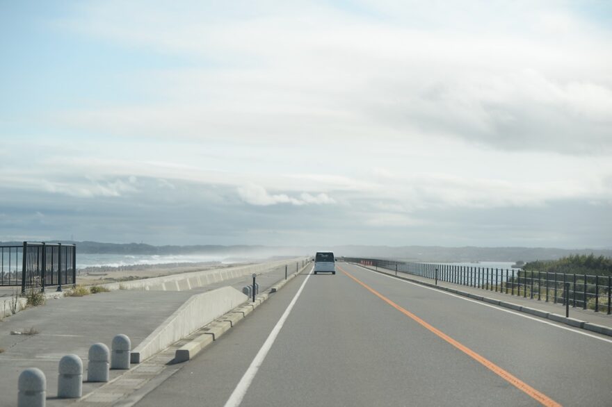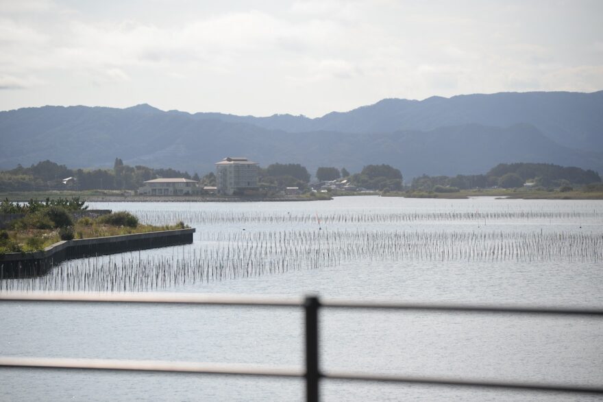 この橋を、原釜方面から磯部方面に渡っていくと、「大洲松川ライン」と呼ばれる道路に出ます。鵜ノ尾岬トンネルから磯部地区へと伸びる直線5kmほどの道路なのですが、青のりの養殖棚が見える松川浦と太平洋を望むことができます。ここにしかない景色。窓を開けてドライブすると、とても気持ちがいいです。サイクリングにももってこいですね。