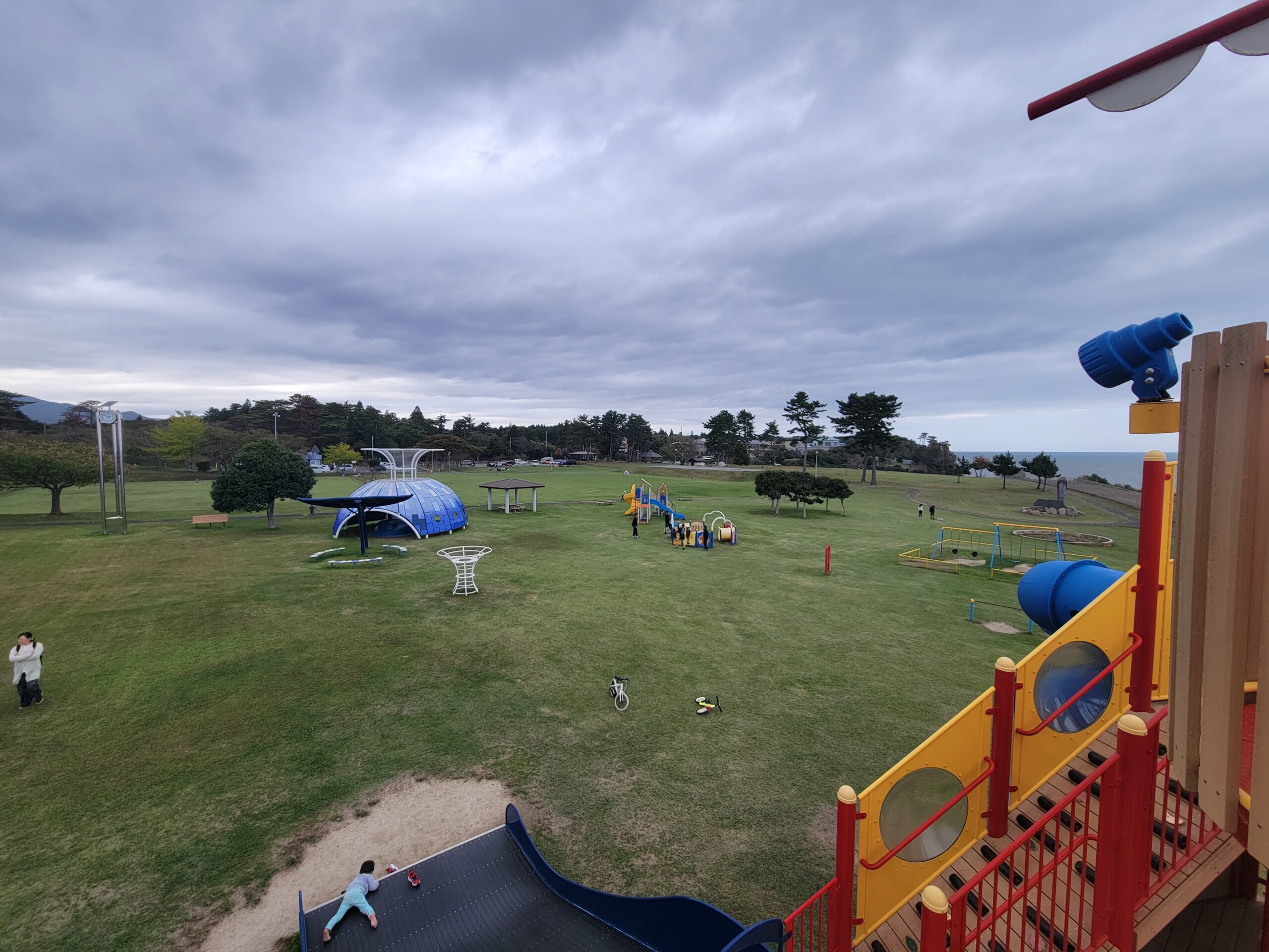 近くには、船をモチーフにした大きな遊具もあります。こちらは、滑り台や展望台など楽しい仕掛けが満載。ほかにも、ブランコや小さな子ども向けの遊具も充実していました。遊具のそばにある芝生広場も広々としていて、晴れた日にはレジャーシートを敷いて海を見ながらピクニックするのも良さそうです。